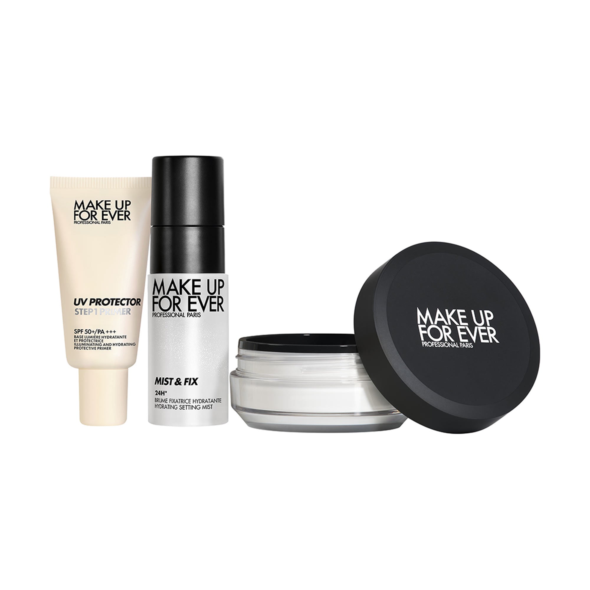 This kit contains 1 mini Step 1 Primer - UV Protector, 1 full-sized HD Skin Perfecting Loose Powder, and 1 mini Mist & Fix.